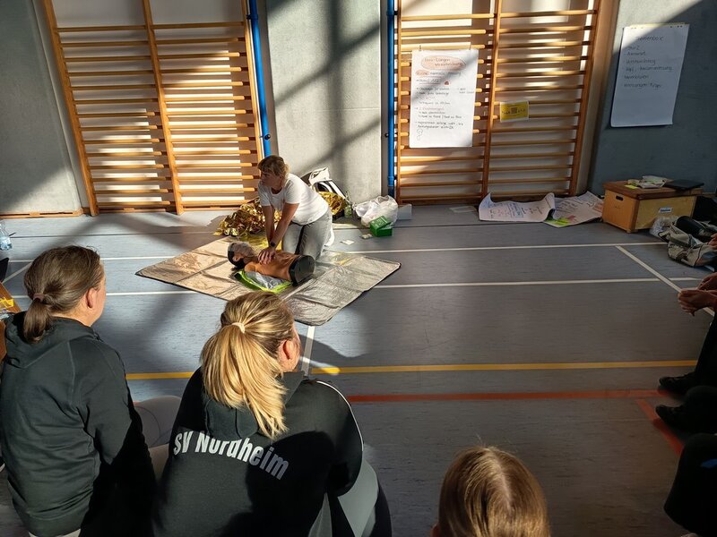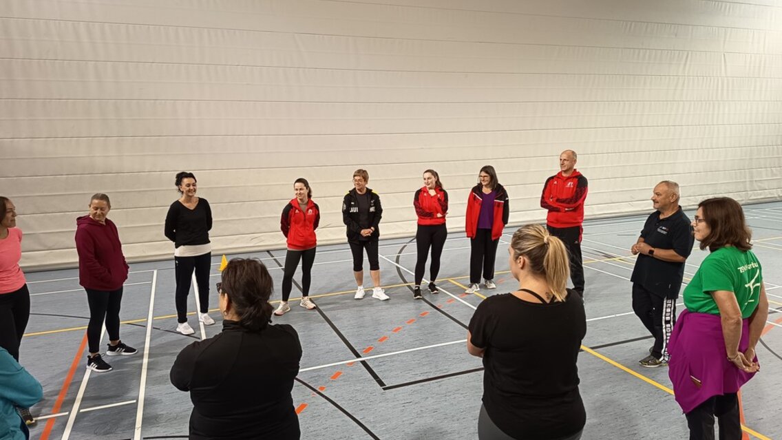 Am 27. und 28. September fanden in der Sebastian-Kneipp-Halle in Dillingen die 35. Breitensport-Aktionstage des Turngaus Oberdonau statt. Jürgen Frey, Vorsitzender des Turngaus, konnte über 30 Teilnehmende begrüßen. Er bedankte sich bei Erika Schweizer, stv. Gauvorsitzende Bildungsarbeit, die den Lehrgang wieder bestens vorbereitet hatte. Um ein möglichst breit gefächertes Angebot für alle anbieten zu können, wurden wieder zwei verschiedene Arbeitskreise gleichzeitig angeboten. Die eine Schiene befasste sich mit dem Kinderturnen, die zweite Schiene mit dem Bereich Fitness- und Gesundheitssport. Für den Bereich Kinderturnen konnten wir Martin Rehm gewinnen. Er gab den Teilnehmenden hier neue Impulse für das Aufwärmen und das Abenteuerturnen in der Turnhalle. Erika Schweizer brachte den Trainerinnen und Trainern anschließend Floorball näher. Am Nachmittag wurden von Katrin Kehl Sofortmaßnahmen bei Verletzungen im Sport besprochen und die Teilnehmenden durften auch selbst gleich üben.